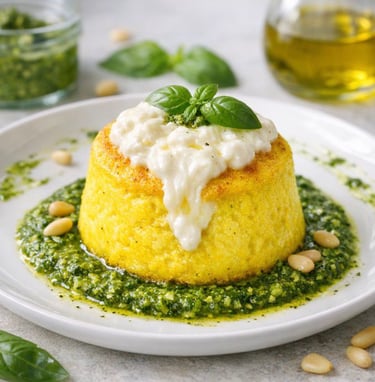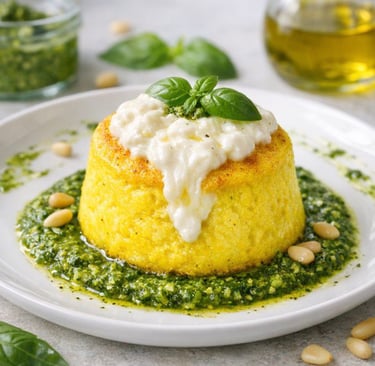 Tortino di ricotta allo zafferano con stracciatella e pesto genovese caserecccio